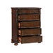 Rich in the aesthetic of Old-World tradition, the design of the Adelina Collection is the culmination of classic accenting that creates an elegant presentation for your bedroom. The intricate scroll detail of the bed’s top rail, and mirror’s frame, provide eye-catching detail, while the bed’s additional accents display prominently by way of the faux leather padded headboard with button-tufting, framed profile, detailed finials - that top the pilasters of the bed – in addition to the acanthus leaf carvings and bun feet that support each piece of the collection. The serpentine fronts of the dresser, nightstand, and chest feature framed drawers and their fixed-pull traditional hardware. Furthering the timeless aesthetic that permeates the collection, is the cherry finish over birch veneer and pine solids.