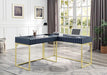 FREIBURG Corner Desk, Antique Blue, 56 3/4"L X 64"W X 30 1/2"H (UP TO 41 1/4"H), 135.1lbs. A wooden frame and metal base harmoniously blend to fit your space. The matte gold finish, with its simple shape and dainty silhouette is in striking contrast with the darker tones of the frame. Front panels are adorned with patterns that conceal the drawer, which open smoothly on ball-bearing glides. To further expand the piece, the right side desk has a lift-top mechanism that allows any health-conscious worker at home unparalleled productivity.
